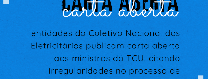 O Coletivo Nacional dos Eletricitários, do qual o SINTEC-RS faz parte, publicou uma carta aberta aos ministros do Tribunal de Contas da União apontando uma lista de irregularidades no processo de privatização da Eletrobras, que devem ser criteriosamente analisadas pelo TCU. Na carta, o CNE reforça os prejuízos que a privatização da companhia trará para os brasileiros e brasileiras e sugere que o processo seja retirado de pauta pelo relator, para que seja possível debater e estudar com maior profundidade o processo.