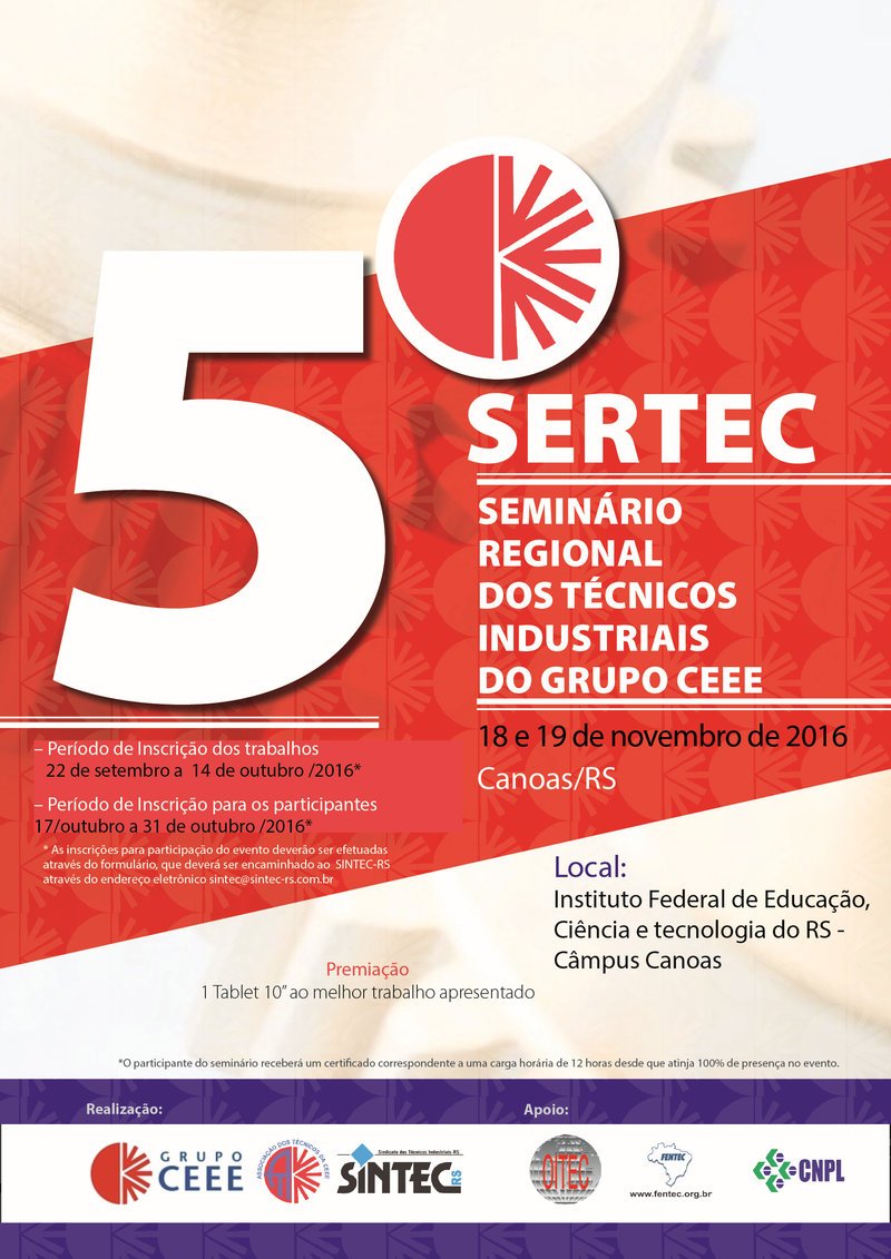 A Associação dos Técnicos da CEEE e o SINTEC-RS comunicam a abertura de inscrição de trabalhos para apresentação no 5º SERTEC – Seminário Regional dos Técnicos Industriais do Grupo CEEE.