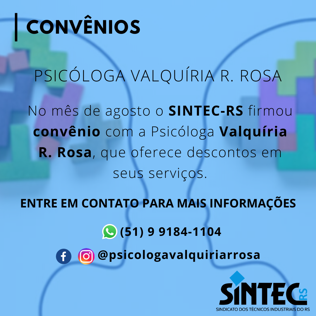 No mês de agosto o SINTEC-RS firmou convênio com a Psicóloga Valquíria R. Rosa, que oferece descontos em seus serviços de psicoterapia individual.