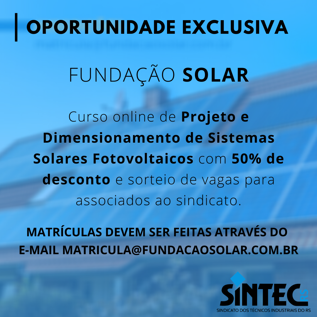 O curso de Projeto e Dimensionamento de Sistemas Solares Fotovoltaicos Conectados a Rede, da Fundação Solar, está com desconto de 50% para associados ao SINTEC-RS! Além desse desconto exclusivo, o sindicato irá sortear aos seus associados 3 vagas gratuitas para participação no curso.