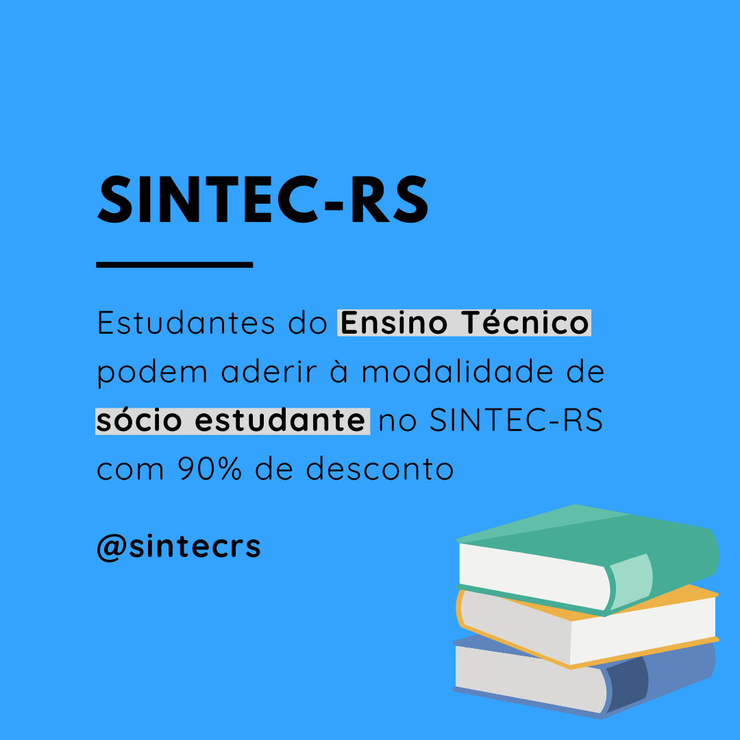 Estudantes do Ensino Técnico podem aderir à modalidade de sócio-estudante no SINTEC-RS com 90% de desconto no valor da anuidade! Associe-se ao sindicato e faça parte da uma entidade que atua há mais de 30 anos na defesa e valorização do Ensino Técnico e dos Técnicos e Técnicas Industriais!