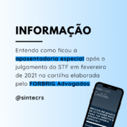 O time de especialistas do Forbrig Advogados Associados, assessoria jurídica do SINTEC-RS, preparou uma cartilha reunido as principais dúvidas sobre o assunto. Confira aqui o material e entenda como ficou a aposentadoria especial após o julgamento do STF.