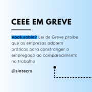 Acompanhe aqui todas as atualizações sobre a greve! Nossa organização ocorre diariamente, através do Piquete Virtual – Greve dos Trabalhadores do Grupo CEEE das 8h às 11h30 e das 13h30 às 16h30. Lembre-se: o registro do ponto de greve deverá ser preenchido diariamente através de formulário: https://forms.gle/RcpCnusnMHip9GJs6.