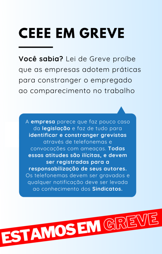 A empresa parece que faz pouco caso da legislação e faz de tudo para identificar e constranger grevistas através de telefonemas e convocações com ameaças. Todas essas atitudes são ilícitas, e devem ser registradas para a responsabilização de seus autores! Os telefonemas devem ser gravados e qualquer notificação deve ser levada ao conhecimento dos Sindicatos.