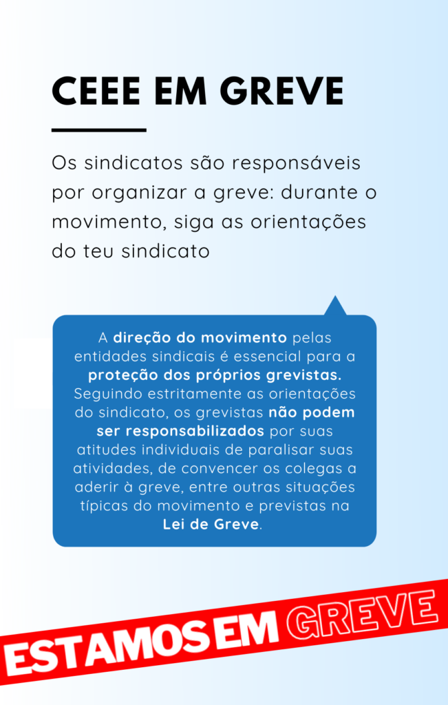 As entidades sindicais são responsáveis pela organização da greve e, por isso, durante o movimento, os trabalhadores e trabalhadoras grevistas devem seguir as orientações do seu sindicato.