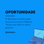 O 3º Seminário de Educação Inclusiva no Ensino Médio e Técnico do IFSul, SEDINETEC, ocorrerá nos dias 19, 20 e 21 de maio com transmissão ao vivo no canal do YouTube do IFSul Sapucaia do Sul. As inscrições para assistir o evento estão abertas até o dia 17 de maio e são gratuitas.