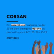 O SINTEC-RS informa a categoria dos Técnicos e Técnicas Industriais e Químicos da CORSAN que a Assembleia Geral Extraordinária realizada no dia 23 de abril deliberou pela aprovação da proposta para o Acordo Coletivo de Trabalho 2020/2021, bem como, pela aprovação da proposta para o Acordo Coletivo de Trabalho 2021/2022.