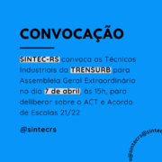 O Diretor-Presidente do SINDICATO DOS TÉCNICOS INDUSTRIAIS DE NÍVEL MÉDIO (2º grau) DO ESTADO DO RIO GRANDE DO SUL, no uso de suas atribuições legais e estatutárias, com base no Art. 5º, XXXV, 7º,VI, XIII, XIV, XXII e XXVI da CF/88, fundamentados pelos Art’s 8, 511 a 514, 545 a 548 e 578, 611 A, 620 da CLT , bem como pelo Art. 104 do Código Civil e também pelas Convenções nºs 103, 135, 154, E 158 da OIT; e pela Súmula 372 TST, convoca os Técnicos Industriais, integrantes da categoria profissional da Empresa de Trens Urbanos de Porto Alegre-TRENSURB, para ASSEMBLEIA GERAL EXTRAORDINÁRIA, a realizar-se no dia 07 de ABRIL de 2021, de maneira virtual pela plataforma ZOOM Meeting (link disponibilizado em www.sintec-rs.com.br), às 14h30min em primeira chamada e às 15h00min em segunda chamada, para deliberarem sobre a seguinte ORDEM DO DIA: