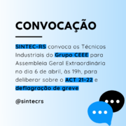 O Diretor-Presidente do SINDICATO DOS TÉCNICOS INDUSTRIAIS DE NÍVEL MÉDIO (2º grau) DO ESTADO DO RIO GRANDE DO SUL, no uso de suas atribuições legais e estatutárias, convoca os Técnicos Industriais integrantes da categoria profissional, empregados e ex-autárquicos da COMPANHIA ESTADUAL DE GERAÇÃO E TRANSMISSÃO DE ENERGIA ELÉTRICA e COMPANHIA ESTADUAL DE DISTRIBUIÇÃO DE ENERGIA ELÉTRICA, para ASSEMBLEIA GERAL EXTRAORDINÁRIA, a realizar-se no dia de 06 de abril de 2021, de maneira virtual pela plataforma Google MEET (link disponibilizado em www.sintec-rs.com.br), às 18h30min em primeira chamada e às 19h00min em segunda chamada, para deliberarem sobre a seguinte ORDEM DO DIA: