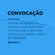 Diretor-Presidente do SINDICATO DOS TÉCNICOS INDUSTRIAIS DE NÍVEL MÉDIO (2º grau) DO ESTADO DO RIO GRANDE DO SUL, no uso de suas atribuições legais e estatutárias, convoca os Técnicos Industriais integrantes da categoria profissional, empregados da COMPANHIA ESTADUAL DE TRANSMISSÃO DE ENERGIA ELÉTRICA – CEEE-T CPFL Energia, para ASSEMBLEIA GERAL EXTRAORDINÁRIA, a realizar-se no dia 23 de janeiro de 2023, de forma virtual pela plataforma Google Meet (link encaminhado por e-mail), às 17h30min em primeira chamada e às 18h00min em segunda chamada, para deliberarem sobre a seguinte ORDEM DO DIA: