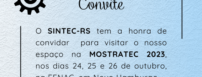 A 38ª MOSTRATEC, maior feira de ciência e tecnologia da América Latina, ocorrerá nos dias 24, 25 e 26 de outubro, no Centro de Eventos da FENAC, em Novo Hamburgo. Durante todos os dias de evento o SINTEC-RS estará no local, divulgando seu trabalho em defesa dos Técnicos e Técnicas Industriais do Rio Grande do Sul.