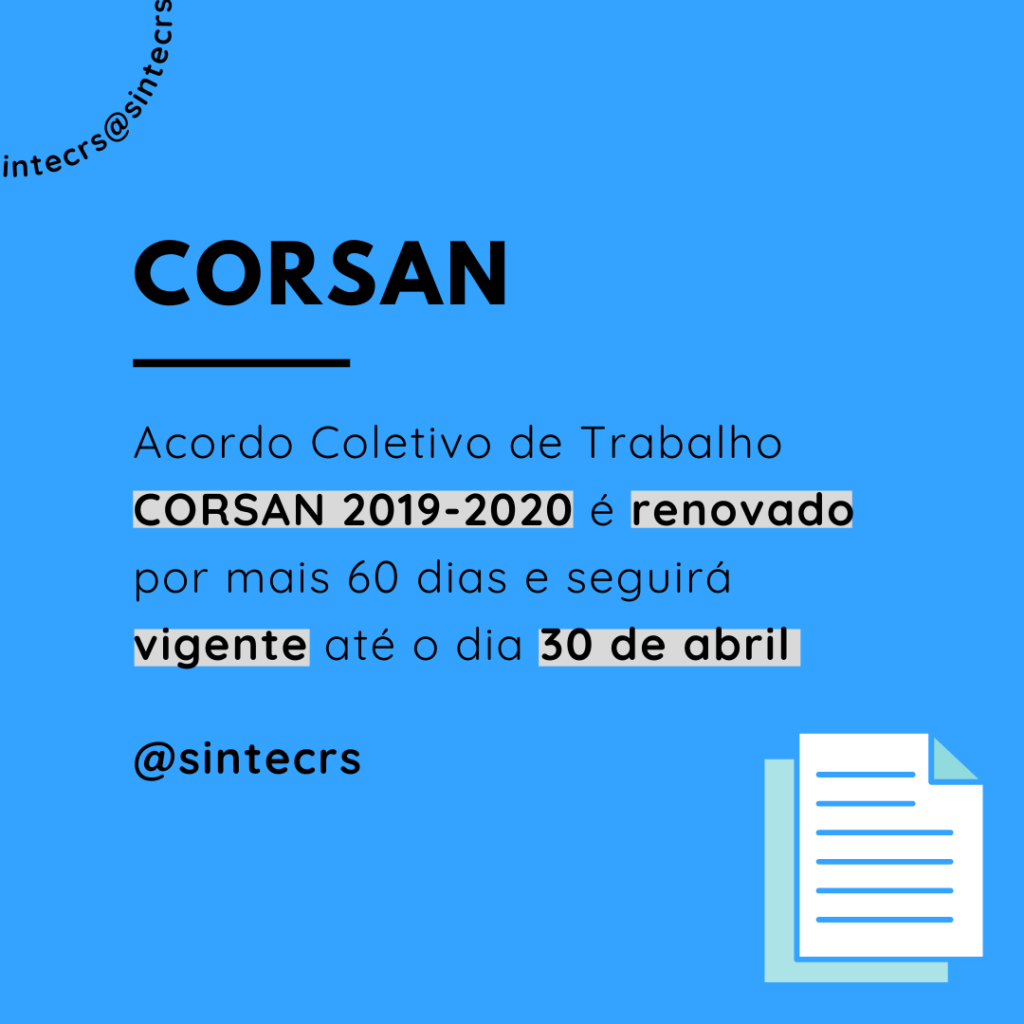 O SINTEC-RS informa que o Acordo Coletivo de Trabalho 2019-2020 CORSAN foi renovado por mais 60 dias e seguirá vigente até o dia 30 de abril de 2021 ou até o encerramento das negociações.