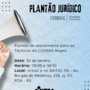 O SINTEC-RS informa aos Técnicos e Técnicas Industriais e Químicos da CORSAN que na terça-feira, 15, realizará uma reunião virtual em conjunto com a assessoria jurídica do sindicato, Forbrig Advogados, para esclarecer as dúvidas da categoria sobre a indenização compensatória substitutiva, prevista no Acordo Coletivo de Trabalho.