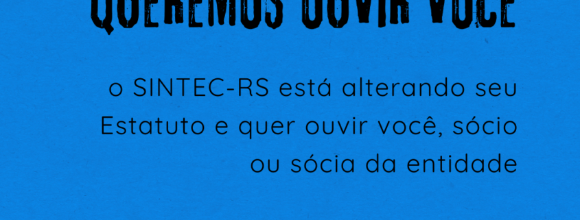 O SINTEC-RS está alterando o seu Estatuto e, para tornar o processo ainda mais democrático e transparente, queremos ouvir você, sócio ou sócia da entidade! Na próxima quarta-feira, 30, a proposta de alteração será apresentada em um evento on-line e exclusivo para associados, às 19h30 na plataforma Google Meet.