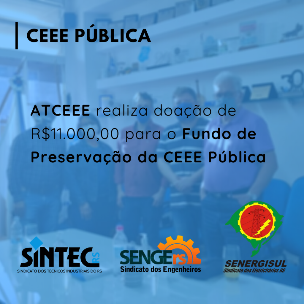 A Associação dos Técnicos da CEEE, ATCEEE, realizou uma doação de onze mil reais para a campanha Fundo de Preservação da CEEE Pública. A ação representa o apoio da Associação à campanha e foi efetivada pela presidente da ATCEEE, Maria Luiza Pereira, em video-reunião com representantes do SINTEC-RS, SENERGISUL e SENGE-RS.