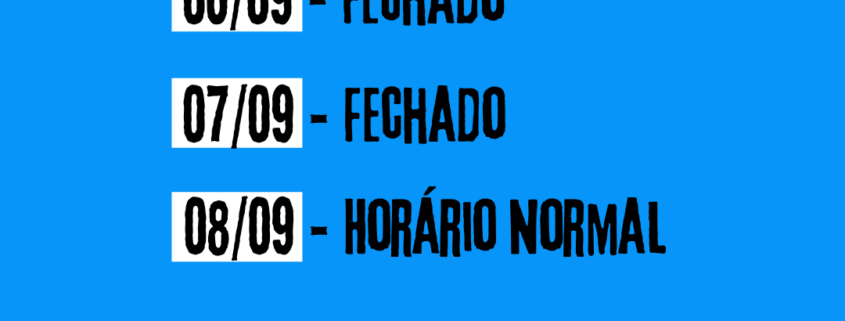 Nos dias 6 e 7 de setembro estaremos fechados. Retornamos no dia 8, em horário normal de atendimento.