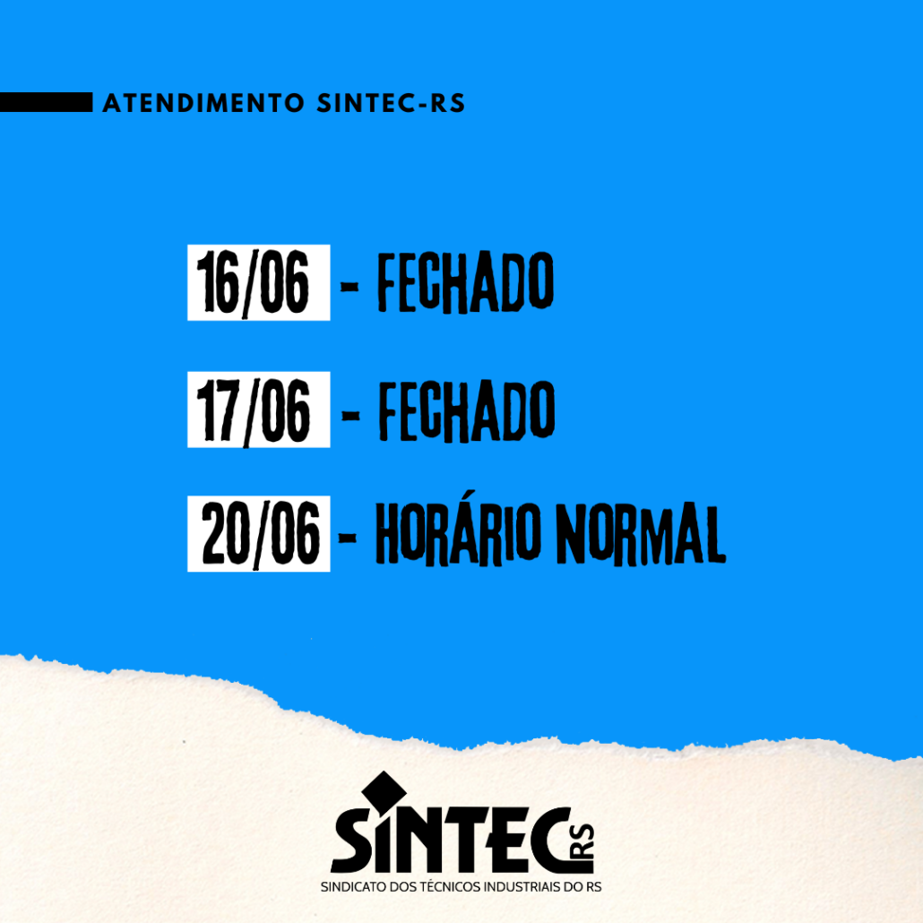 O SINTEC-RS informa que, devido ao feriado de Corpus Christi, não estará atendendo nos dias 16 e 17 de junho. O atendimento será retomado normalmente na segunda-feira, 20 de junho.