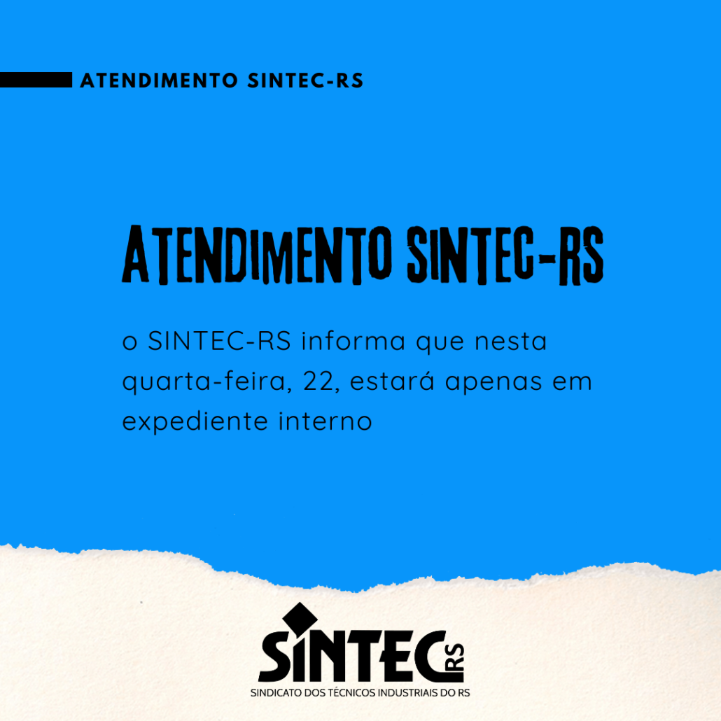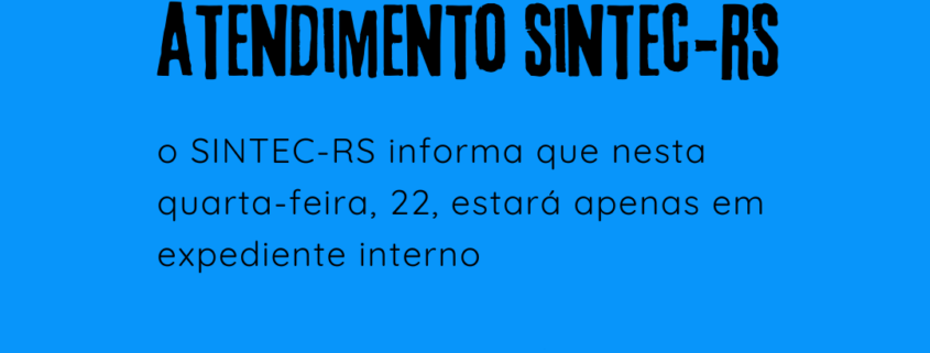 O SINTEC-RS informa que nesta quarta-feira, 22, estará em expediente interno, sem atendimento ao público na sede do sindicato.