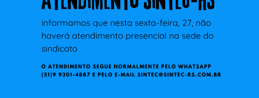 O SINTEC-RS informa que nesta sexta-feira, 27, não haverá atendimento presencial na sede do sindicato, devido aos transtornos causados pela chuva.