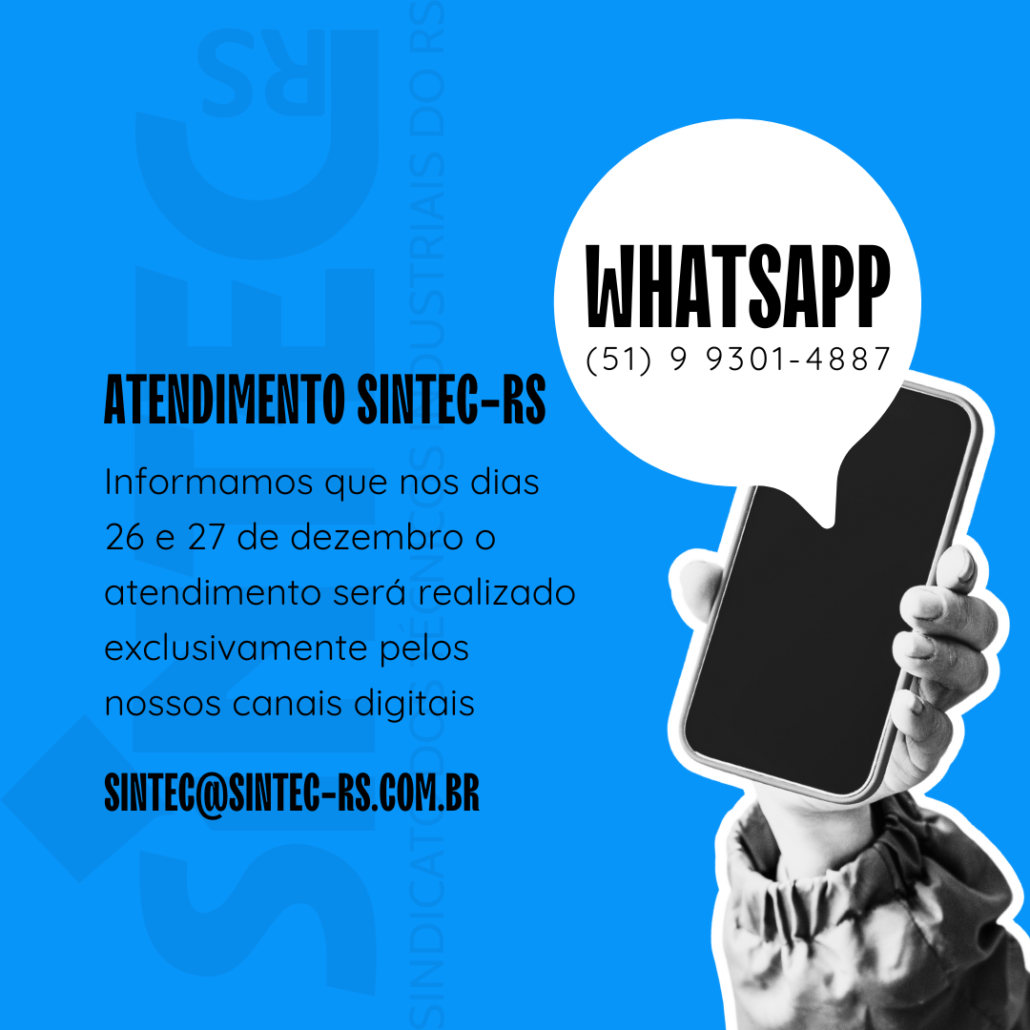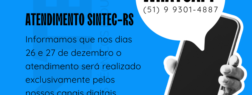 Nos dias 26 e 27 de dezembro, o atendimento do SINTEC-RS será realizado exclusivamente pelos nossos canais digitais: