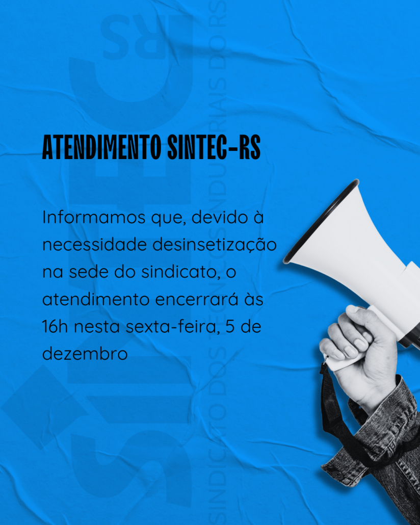 O SINTEC-RS informa que, devido à necessidade de desinsetização na sede do sindicato, o atendimento encerrará às 16h nesta sexta-feira, 5 de dezembro.