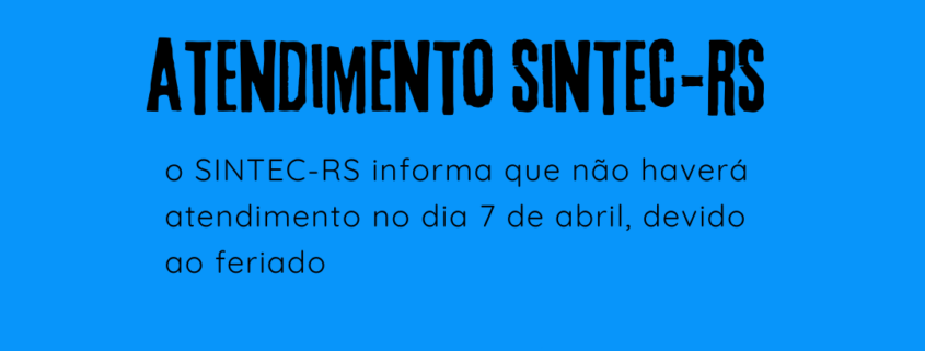 O SINTEC-RS informa que não haverá expediente no dia 7 de abril, devido ao feriado.