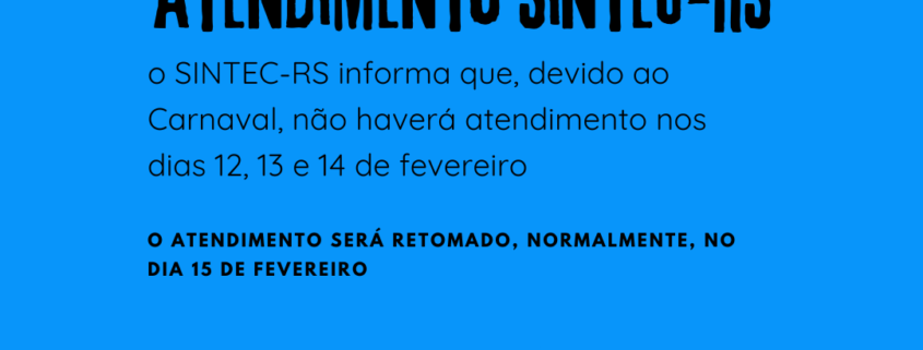 O SINTEC-RS informa que não haverá expediente nos dias 12, 13 e 14 de fevereiro, devido ao Carnaval. No dia 15 de fevereiro, quinta-feira, retornaremos em horário normal de atendimento.
