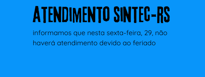O SINTEC-RS informa que, devido ao feriado, não haverá atendimento na sexta-feira, 29 de março. Retornaremos na segunda-feira, 1º de abril.