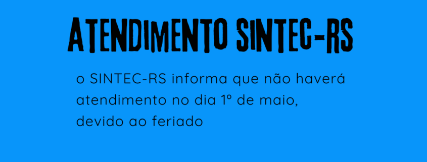 O SINTEC-RS informa que não haverá expediente no dia 1º de maio, devido ao feriado. Retornaremos na terça-feira, 2 de maio, às 10h.