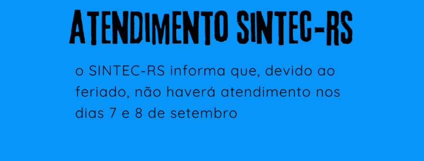 O SINTEC-RS informa que, devido ao feriado do dia da Independência do Brasil, não haverá atendimento nos dias 7 e 8 de setembro. Retornaremos na segunda-feira, 11 de setembro.