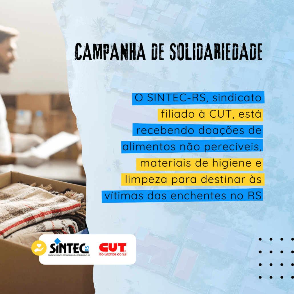 O SINTEC-RS, sindicato filiado à CUT, está recebendo doações de alimentos não perecíveis, materiais de higiene e limpeza para destinar às vítimas das enchentes no Rio Grande do Sul. Os donativos arrecadados pelos sindicatos e diretamente na CUT-RS serão entregues nos municípios atingidos durante o Dia Estadual de Solidariedade, que será realizado no dia 23 de setembro (sábado).