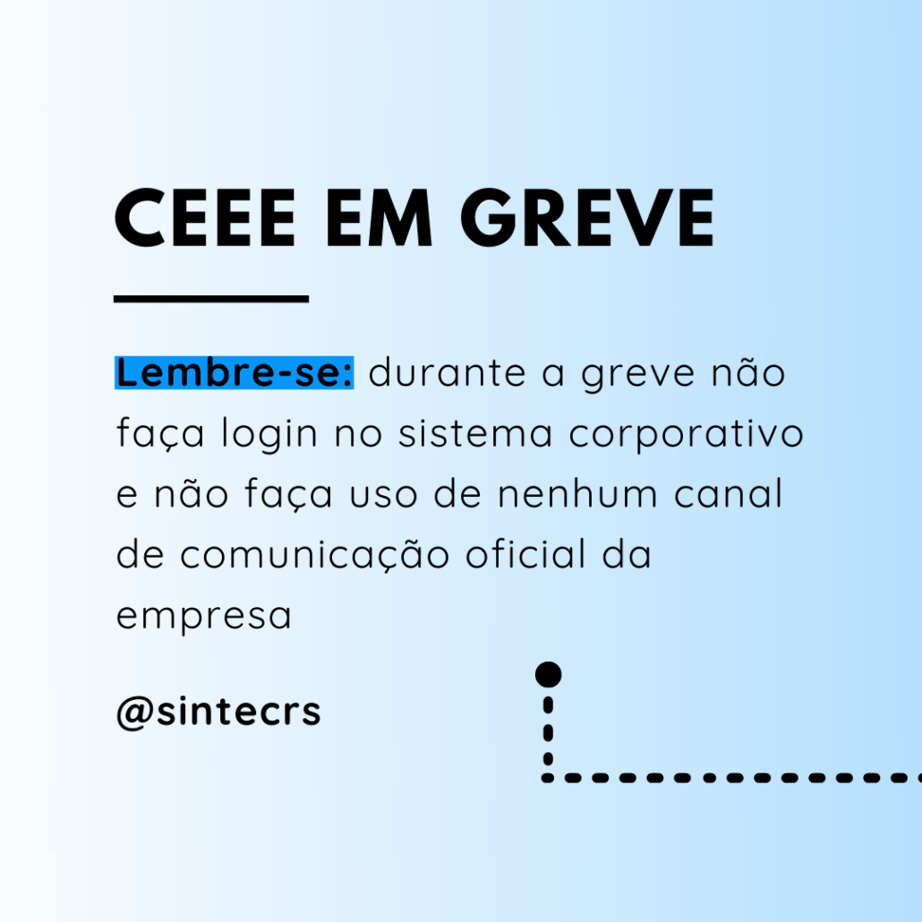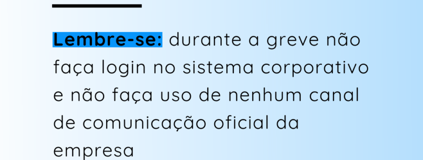 Lembre-se: durante a greve não faça login no sistema corporativo e não faça uso de nenhum canal de comunicação oficial da empresa. Mantenha-se em contato permanente com o dirigente sindical, ou outro representante da entidade responsável pela organização do movimento em seu local de trabalho.