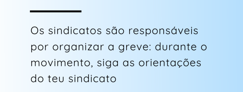 As entidades sindicais são responsáveis pela organização da greve e, por isso, durante o movimento, os trabalhadores e trabalhadoras grevistas devem seguir as orientações do seu sindicato.