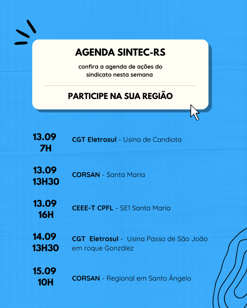 Confira a agenda do SINTEC-RS nos dias 13, 14 e 15 de setembro:
