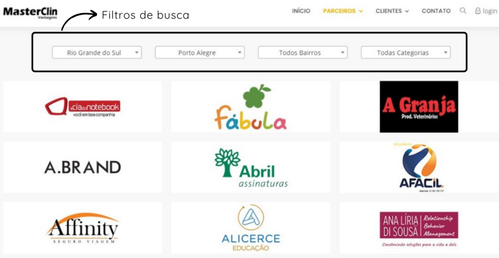 4º passo: você pode filtrar a busca no site e pesquisas por parceiros a partir de estados, cidades, bairros e categorias. Pesquise de acordo com os seus interesses e conheça as milhares de vantagens que o SINTEC-RS, em parceria com a Masterclin, oferecem para você.