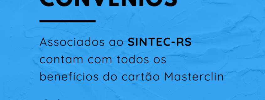 O SINTEC-RS, em parceria com a Masterclin, oferece aos seus associados todos os benefícios do cartão Masterclin. São mais de 9 mil estabelecimentos com descontos e vantagens fornecidos mediante a apresentação do cartão em lojas físicas, comércios online e serviços em geral.