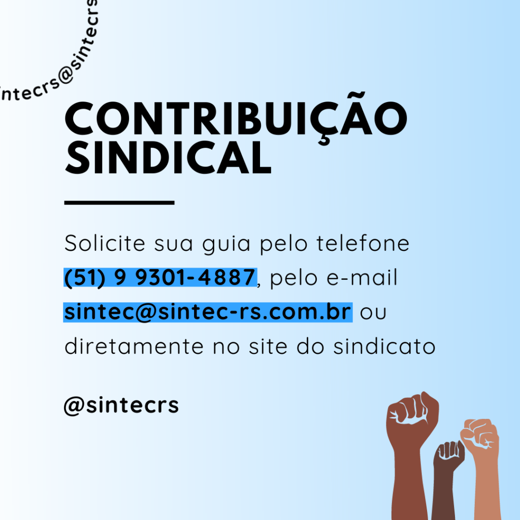 A Contribuição Sindical de 2021, no valor de R$90,00, já pode ser paga e a emissão da guia pode ser solicitada diretamente pelo telefone (51) 9 9301-4887, pelo e-mail sintec@magenta-viper-548333.hostingersite.com ou aqui no site do SINTEC-RS.