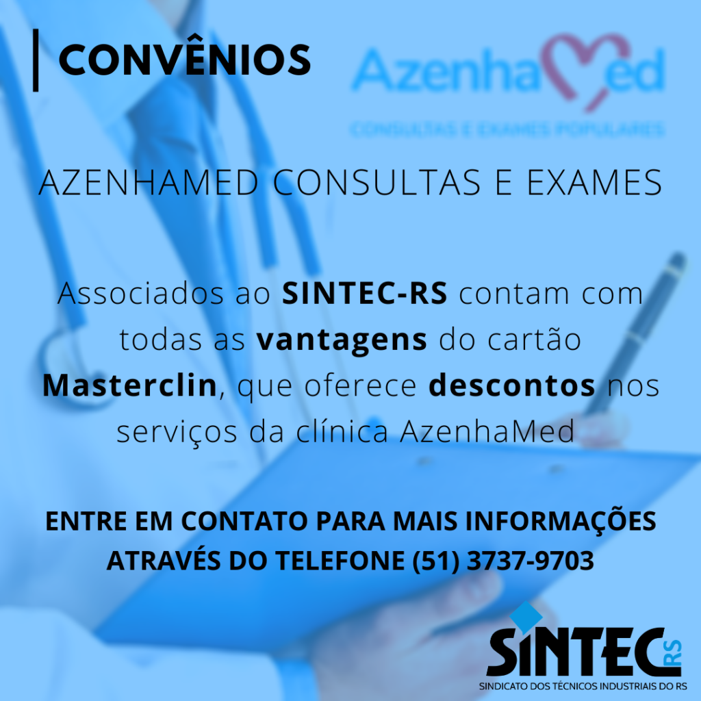 Associados ao SINTEC-RS contam com todas as vantagens do Cartão Masterclin, que oferece descontos nos serviços da clínica AzenhaMed. Para mais informações, entre em contato através do telefone (51) 3737-9703 ou do WhatsApp (51) 99610-9703.
