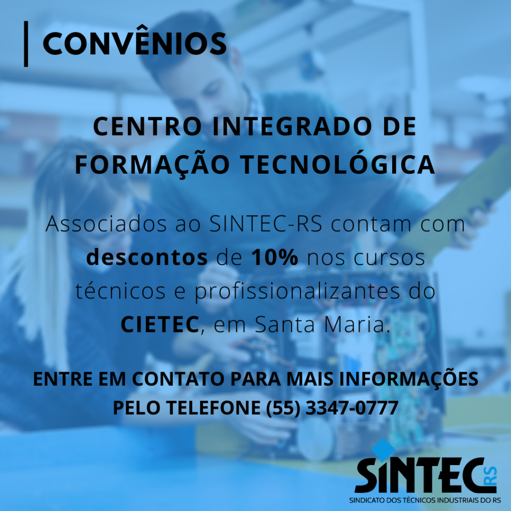 Associados ao SINTEC-RS contam com todas as vantagens do cartão Masterclin, que oferece descontos de 10% nos cursos técnicos e profissionalizantes do Centro Integrado de Formação Tecnológica, CIETEC.