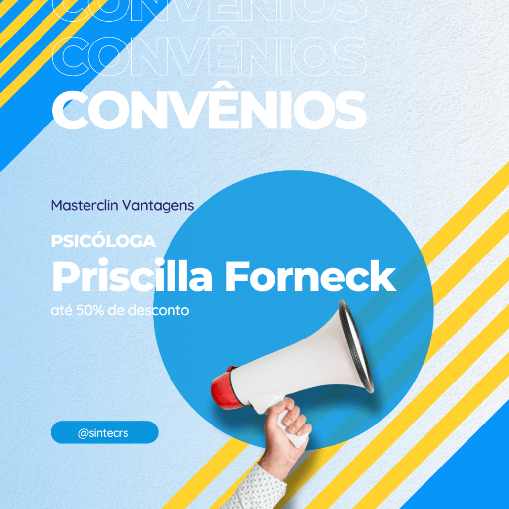 Associados ao SINTEC-RS contam com todos os benefícios do cartão Masterclin, que garante descontos de até 50% com a psicóloga Priscilla Forneck, que atende em Porto Alegre. Os serviços de psicoterapia de adultos e adolescentes contam com 50% de desconto e os serviços de avaliação neuropsicológica contam com 40% de desconto.