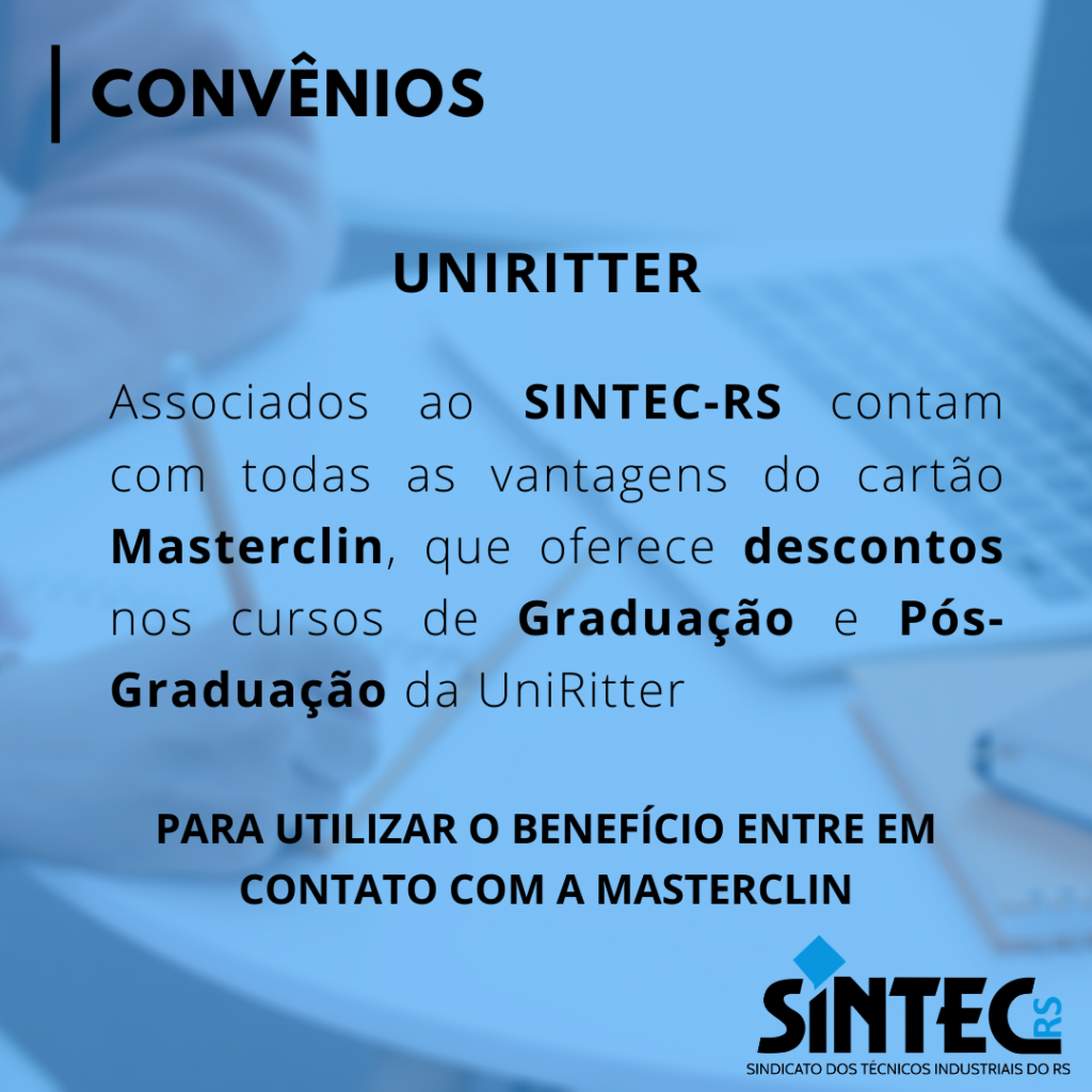 Associados ao SINTEC-RS contam com todas as vantagens do cartão Masterclin, que oferece descontos de 10% nos cursos de Graduação e de até 40% nos cursos de Pós-Graduação da UniRitter.