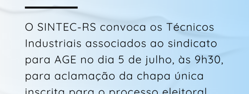 O Diretor-Presidente do SINDICATO DOS TÉCNICOS INDUSTRIAIS DE NÍVEL MÉDIO (2º grau) DO ESTADO DO RIO GRANDE DO SUL (SINTEC-RS), no uso de suas atribuições legais e estatutárias, com base no art. 15 e 16 do Estatuto da Entidade, bem como, art. 4 e 17 do Regulamento Eleitoral, convoca os TÉCNICOS INDUSTRIAIS ASSOCIADOS AO SINDICATO para ASSEMBLEIA GERAL ELEITORAL, a realizar-se no dia 5 de julho de 2023, de forma presencial na sede do Sindicato, Avenida Borges de Medeiros, nº 328, sala 112, Bairro Centro Histórico, CEP: 9020-020, na cidade de Porto Alegre/RS, e de forma virtual pela plataforma Google Meet (link disponibilizado por e-mail), às 09h00min em primeira chamada e às 09h30min em segunda chamada, para deliberarem sobre a seguinte ORDEM DO DIA: