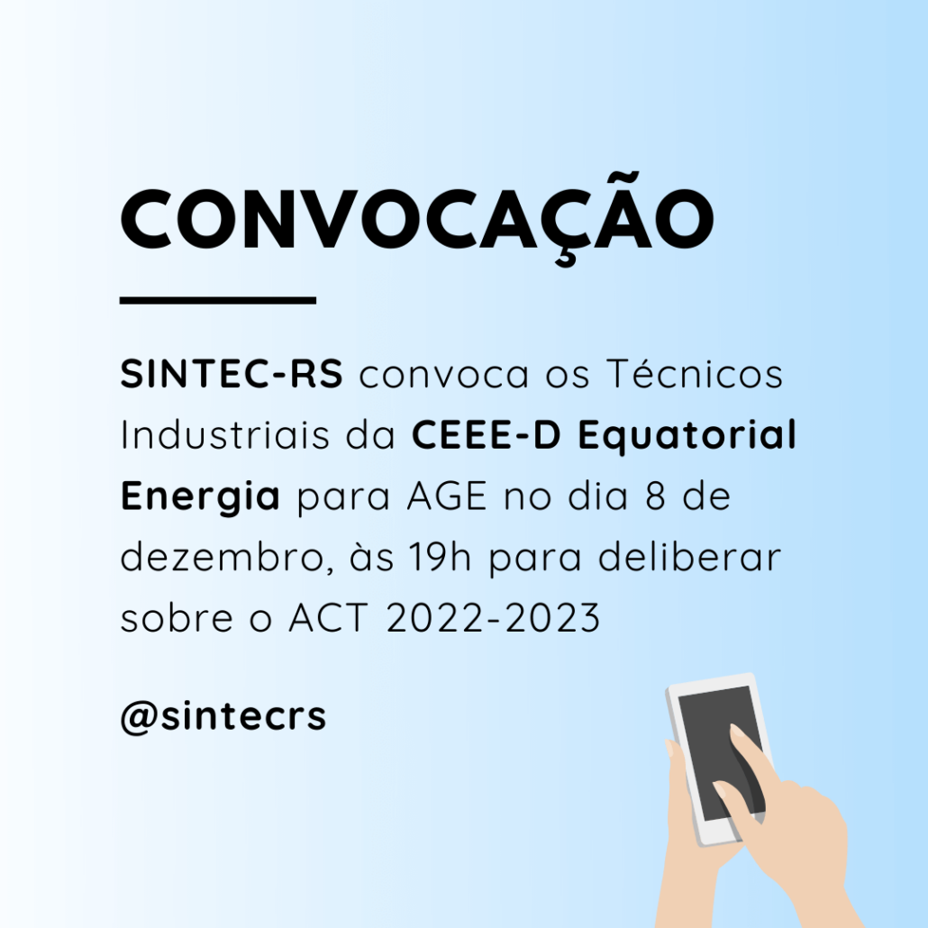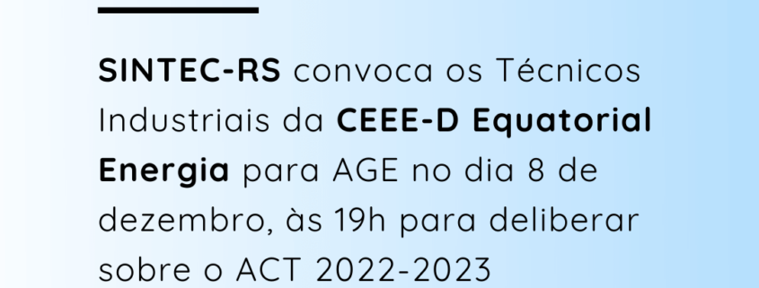 O Diretor-Presidente do SINDICATO DOS TÉCNICOS INDUSTRIAIS DE NÍVEL MÉDIO (2º grau) DO ESTADO DO RIO GRANDE DO SUL, no uso de suas atribuições legais e estatutárias, com base no Art. 5º, XXXV, 7º,VI, XIII, XIV, XXII e XXVI da CF/88, fundamentados pelos Art’s 8, 511 a 514, 545 a 548 e 578, 611 A, 620 da CLT , bem como pelo Art. 104 do Código Civil e também pelas Convenções nºs 103, 135, 154, E 158 da OIT; e pela Súmula 372 TST, convoca os Técnicos Industriais integrantes da categoria profissional, empregados da COMPANHIA ESTADUAL DE DISTRIBUIÇÃO DE ENERGIA ELÉTRICA – CEEE-D EQUATORIAL ENERGIA, para ASSEMBLEIA GERAL EXTRAORDINÁRIA, a realizarse no dia 08 de dezembro de 2021, de maneira virtual pela plataforma Google Meet (meet.google.com/dwk-hjmj-xwi), às 18h30min em primeira chamada e às 19h00min em segunda chamada, para deliberarem sobre a seguinte ORDEM DO DIA: