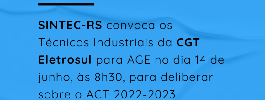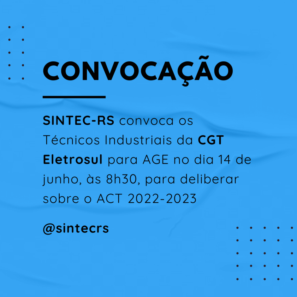 O Diretor-Presidente do SINDICATO DOS TÉCNICOS INDUSTRIAIS DE NÍVEL MÉDIO DO ESTADO DO RIO GRANDE DO SUL – SINTEC-RS, no uso de suas atribuições legais e estatutárias, convoca a categoria dos Técnicos Industriais empregados da ELETROBRAS – CGT ELETROSUL para ASSEMBLEIA GERAL EXTRAORDINÁRIA, a realizar-se no dia 14/06/2022, de maneira virtual, através da plataforma Google Meet (link disponibilizado por e-mail), às 08h00min em primeira chamada e às 08h30min, em segunda chamada, para deliberarem sobre a seguinte ORDEM DO DIA: