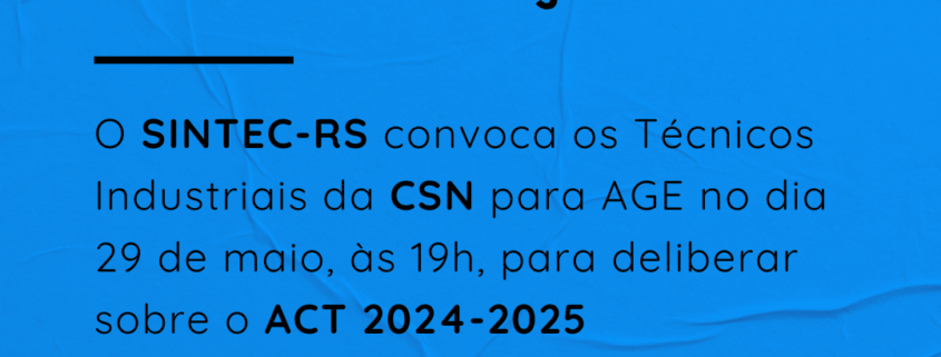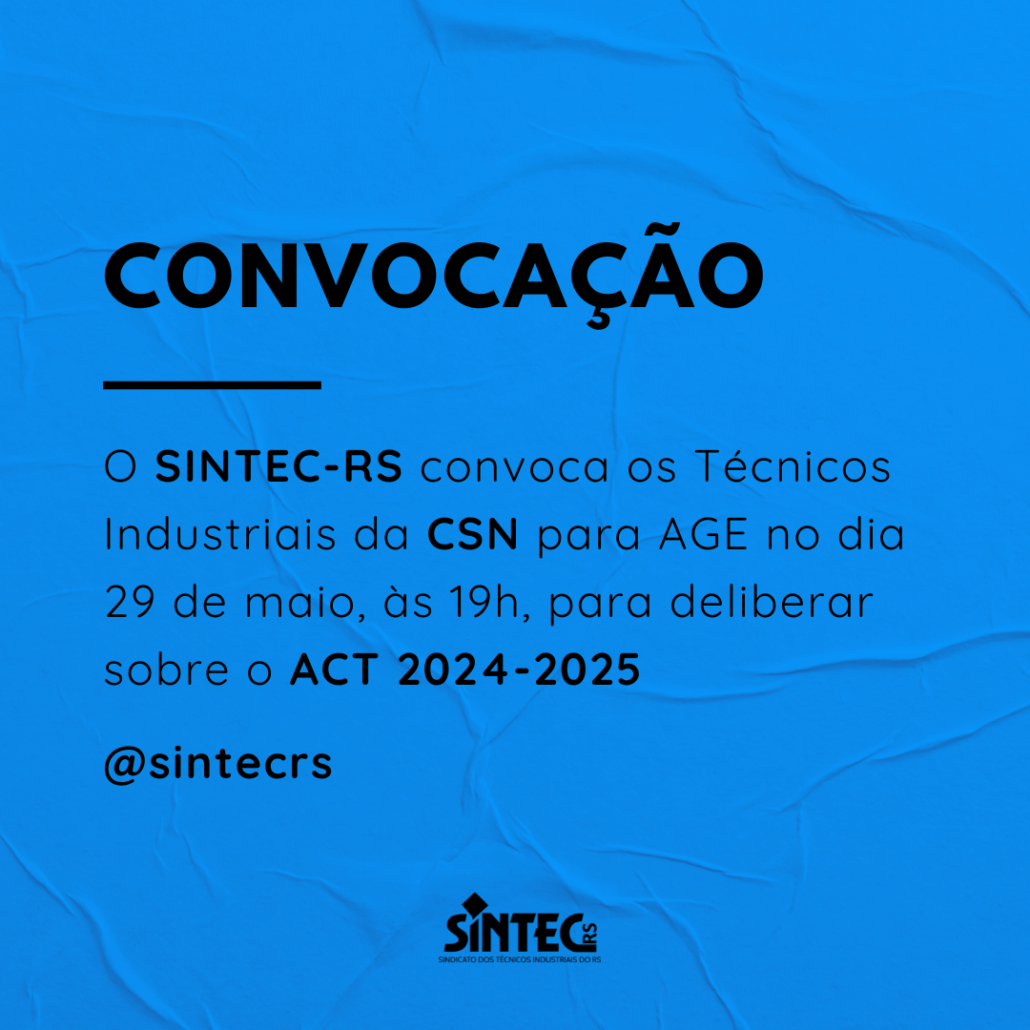 O Diretor-Presidente do SINDICATO DOS TÉCNICOS INDUSTRIAIS DE NÍVEL MÉDIO DO ESTADO DO RIO GRANDE DO SUL – SINTEC/RS, no uso de suas atribuições legais e estatutárias, conforme Art. 16, item “I” do Art. 17 e em especial o Art. 18 do Estatuto vigente, convoca os técnicos industriais da CEEE-G CSN para ASSEMBLEIA GERAL EXTRAORDINÁRIA, a realizar-se no dia 29 de maio de 2024, de forma virtual, pela plataforma Google Meet (link disponibilizado por e-mail) às 18h30min em primeira chamada e às 19h00min, em segunda chamada, para deliberarem sobre a seguinte ORDEM DO DIA: