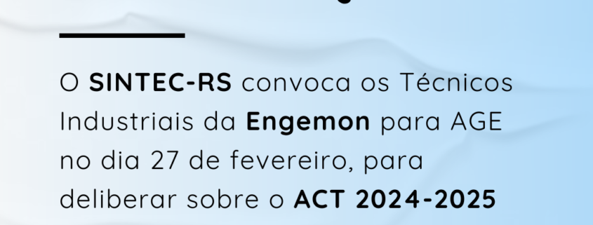 O Diretor-Presidente do SINDICATO DOS TÉCNICOS INDUSTRIAIS DE NÍVEL MÉDIO DO ESTADO DO RIO GRANDE DO SUL – SINTEC-RS, no uso de suas atribuições legais e estatutárias, convoca categoria dos Técnicos Industriais empregados da ENGEMON para ASSEMBLEIA GERAL EXTRAORDINÁRIA a realizar-se no dia 27 de fevereiro de 2024, em formato virtual pela plataforma Google Meet (link disponibilizado por e-mail), às 19h00min em primeira chamada e às 19h30min em segunda chamada, para deliberarem sobre a seguinte ORDEM DO DIA: