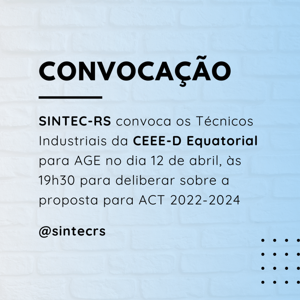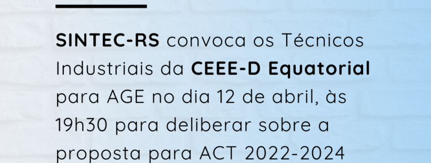 O Diretor-Presidente do SINDICATO DOS TÉCNICOS INDUSTRIAIS DE NÍVEL MÉDIO (2º grau) DO ESTADO DO RIO GRANDE DO SUL, no uso de suas atribuições legais e estatutárias, convoca os Técnicos Industriais integrantes da COMPANHIA ESTADUAL DE DISTRIBUIÇÃO DE ENERGIA ELÉTRICA – CEEE-D Equatorial Energia, para ASSEMBLEIA GERAL EXTRAORDINÁRIA, a realizar-se no dia de 12 de abril de 2022, de maneira virtual pela plataforma Google Meet (link disponibilizado por e-mail), às 19h00min em primeira chamada e às 19h30min em segunda chamada, para deliberarem sobre a seguinte ORDEM DO DIA: