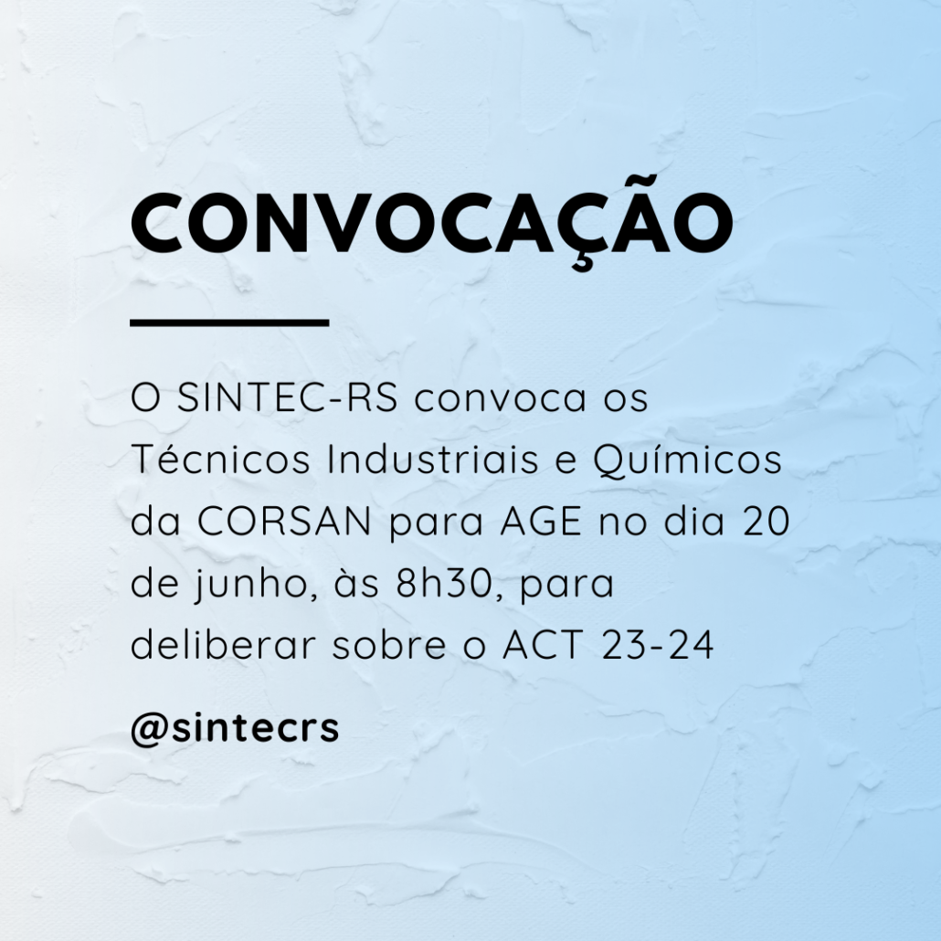 O Diretor-Presidente do SINDICATO DOS TÉCNICOS INDUSTRIAIS DE NÍVEL MÉDIO (2º grau) DO ESTADO DO RIO GRANDE DO SUL, no uso de suas atribuições legais e estatutárias, com base no Art. 5º, XXXV, 7º,VI, XIII, XIV, XXII e XXVI da CF/88, fundamentados pelos Art’s 8, 511 a 514, 545 a 548 e 578, 611 A, 620 da CLT, bem como pelo Art. 104 do Código Civil e também pelas Convenções nºs 103, 135, 154, E 158 da OIT; e pela Súmula 372 TST, convoca os Técnicos Industriais e Técnicos em Química, integrantes da categoria profissional da COMPANHIA RIOGRANDENSE DE SANEAMENTOCORSAN, para ASSEMBLEIA GERAL EXTRAORDINÁRIA, a realizar-se no dia 20 de junho de 2023, no Clube Farrapos, localizado na Rua Prof. Cristiano Fischer, 1331 – Jardim do Salso, nesta Capital, às 08h00min em primeira chamada e às 08h30min em segunda chamada, para deliberar sobre a seguinte ORDEM DO DIA: