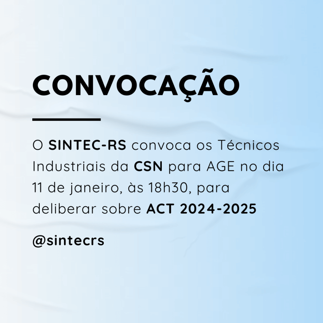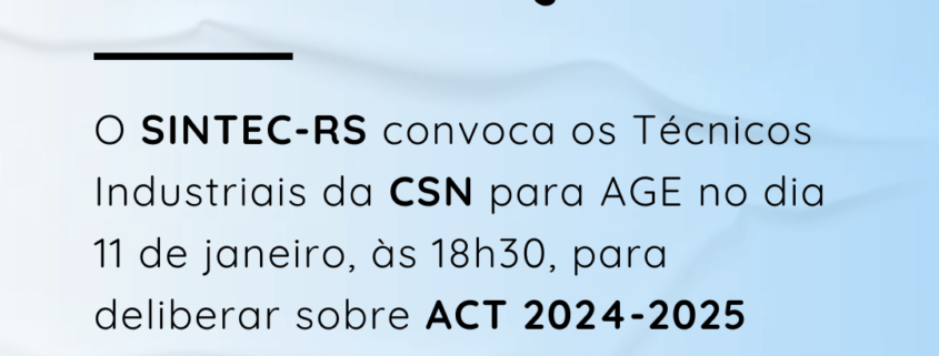 O Diretor-Presidente do SINDICATO DOS TÉCNICOS INDUSTRIAIS DE NÍVEL MÉDIO DO ESTADO DO RIO GRANDE DO SUL/SINTEC-RS, no uso de suas atribuições legais e estatutárias, convoca os Técnicos Industriais integrantes da categoria profissional, empregados da COMPANHIA ESTADUAL DE GERAÇÃO DE ENERGIA ELÉTRICA/CEEE-G CSN, para ASSEMBLEIA GERAL EXTRAORDINÁRIA, a realizar-se no dia 11/01/2024, de maneira virtual através da plataforma Google Meet (link disponibilizado por e-mail) às 18h00min em primeira chamada e às 18h30min em segunda chamada, para deliberarem sobre a seguinte ORDEM DO DIA: