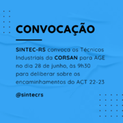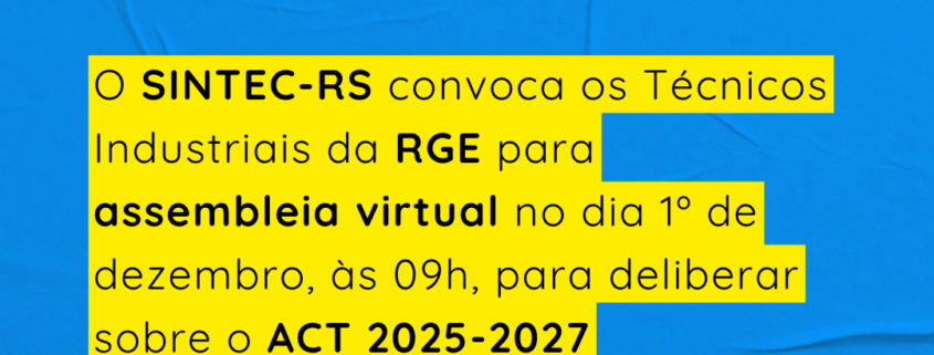 O Diretor-Presidente do SINDICATO DOS TÉCNICOS INDUSTRIAIS DE NÍVEL MÉDIO DO ESTADO DO RIO GRANDE DO SUL – SINTEC-RS, no uso de suas atribuições legais e estatutárias, convoca categoria dos Técnicos Industriais empregados da RIO GRANDE ENERGIA – RGE para ASSEMBLEIA GERAL EXTRAORDINÁRIA a realizar-se no dia 1º de dezembro de 2025, em formato virtual pela plataforma Google Meet (LINK DISPONIBILIZADO POR E-MAIL), às 08h30min em primeira chamada e às 09h00min em segunda chamada, para deliberarem sobre a seguinte ORDEM DO DIA: